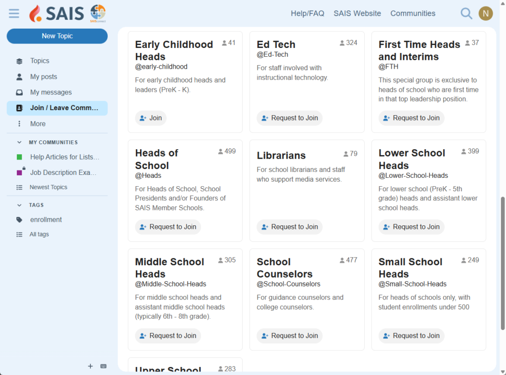 SAIS Connect is the online member community for SAIS member schools. There are communities for most school roles. This includes: