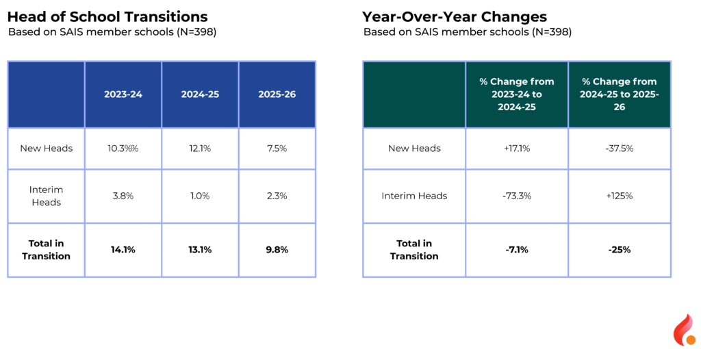 Leadership transitions can bring a range of emotions, including excitement and anxiety, especially when a new head of school onboards. Nearly 10% of SAIS member schools faced this situation during the 2025-26 academic year, with 7.5% of heads of school new to their role and 2.3% serving as an interim head. While the number of new heads has been on a steady decline for the past few years, suggesting some stabilization in the leadership landscape, the number of interim heads is on a slight upward trend.